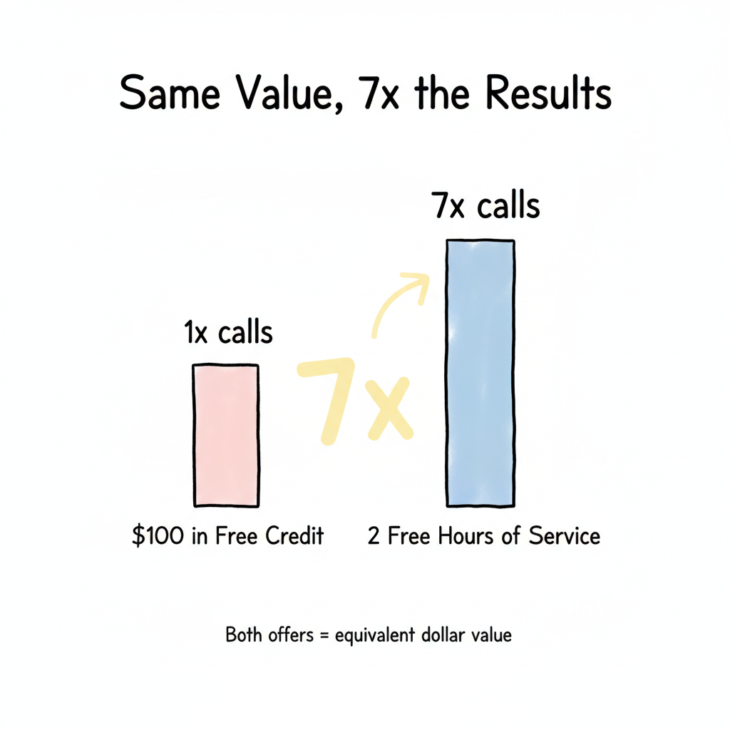 It is amazing what impact the right offer can make on conversion rates. Here is an anecdotal A/B test. After a form fill completion, we prompted the user to call in within 30 minutes to receive one of two offers. One offer promoted “2 free hours of service” if you called in and signed up, and the second offer was of equivalent value, but was communicated as “$100 in free credit” when you sign up. Upon launching the test, we found that the offer for “2 free hours of service” drove 7x the call volume of the other offer, even though the 2 offers were of equivalent value! As research shows, leads who call in are much more likely to do business, and, on average, produce higher sales values. Naturally, this cohort of users provided a statistically significant increase in revenue for our client.