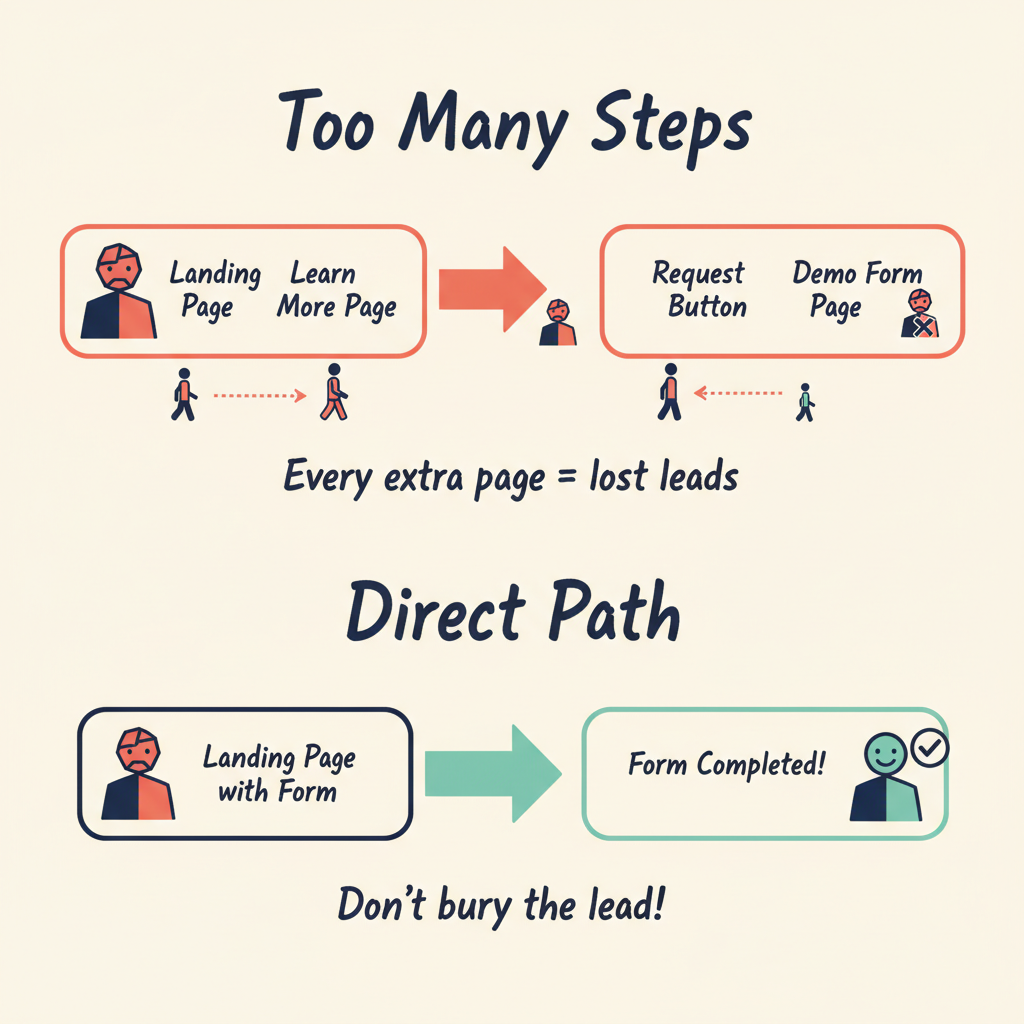 Don’t bury the lead! If you want someone to sign up for a demo, then you should let them sign up for that demo on the first page of your site. I am always amazed to see how adding pages to a workflow plummets conversion rates. Many landing pages will include a “Request a Demo Button” which drives a user to a second page to complete a form. Do yourself a favor and cut out any unnecessary steps in your workflow to maximize your leads.