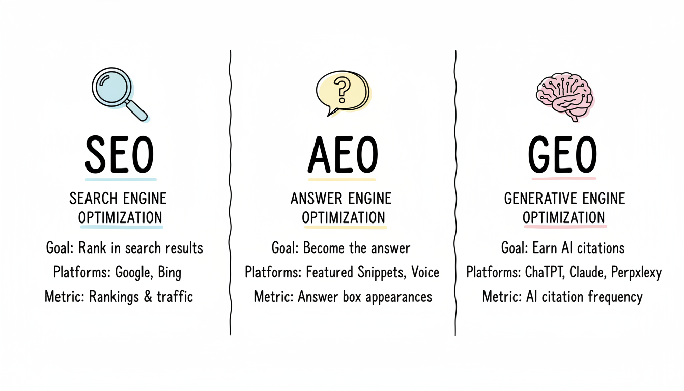 SEO provides the foundation. Without crawlability, indexing, and basic relevance, neither AEO nor GEO can succeed. AI systems can't cite content they can't access.