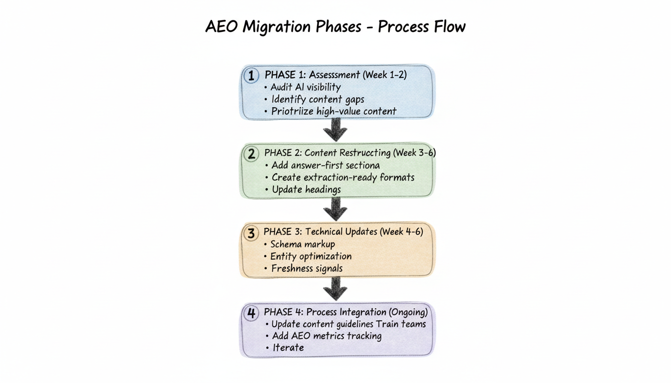 Organizations with established SEO programs face a strategic question: how to adapt existing content and processes for AI search visibility without abandoning what already works. AEO migration isn't about replacing SEO—it's about layering answer engine optimization capabilities onto existing foundations. The transition requires content restructuring, process updates, and organizational alignment.