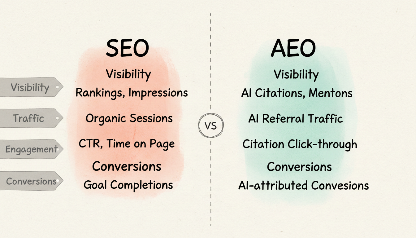 Metric Category | SEO Metrics | AEO Metrics |
