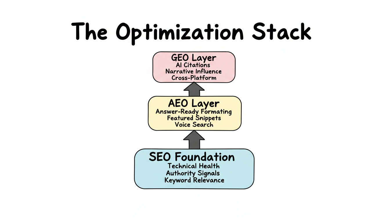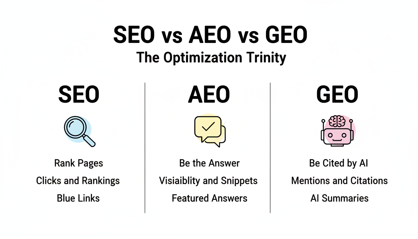 Search optimization in 2026 requires three complementary disciplines: SEO (Search Engine Optimization), AEO (Answer Engine Optimization), and GEO (Generative Engine Optimization). Each serves a different purpose in how users discover information—from traditional search rankings to featured answers to AI-generated citations.