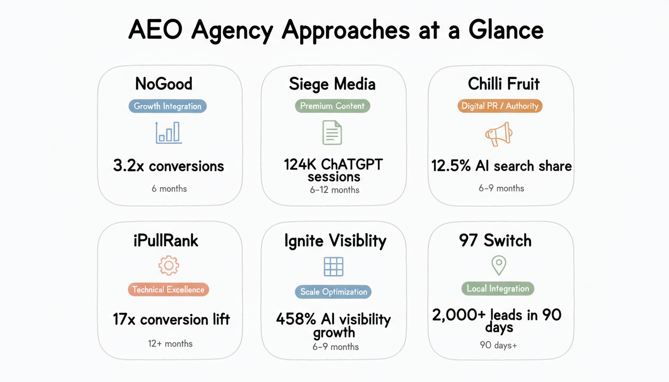 Different agencies produce results through different methodologies, and understanding the differences between SEO vs AEO strategies helps explain their varying approaches.