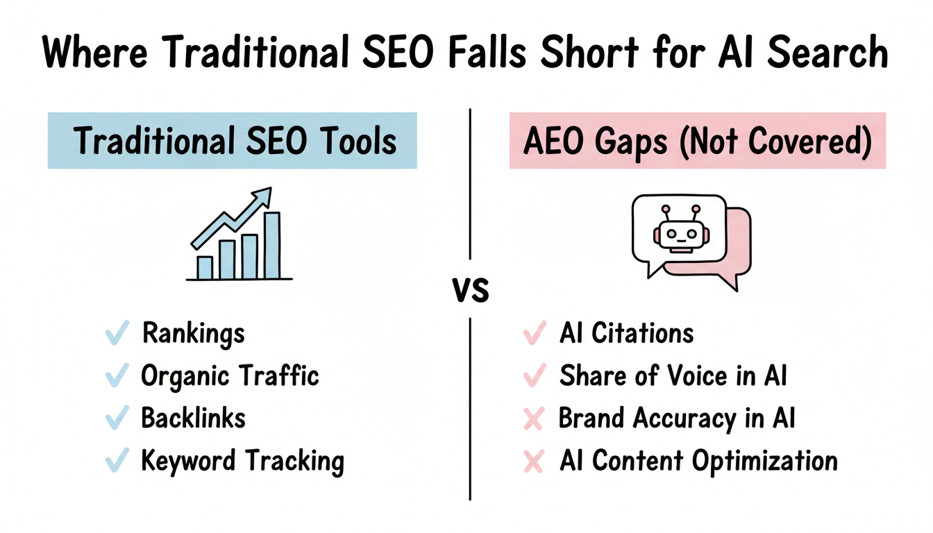 AEO software addresses gaps in traditional tools. Standard SEO platforms don't track AI citations. Dedicated AEO software fills this need.