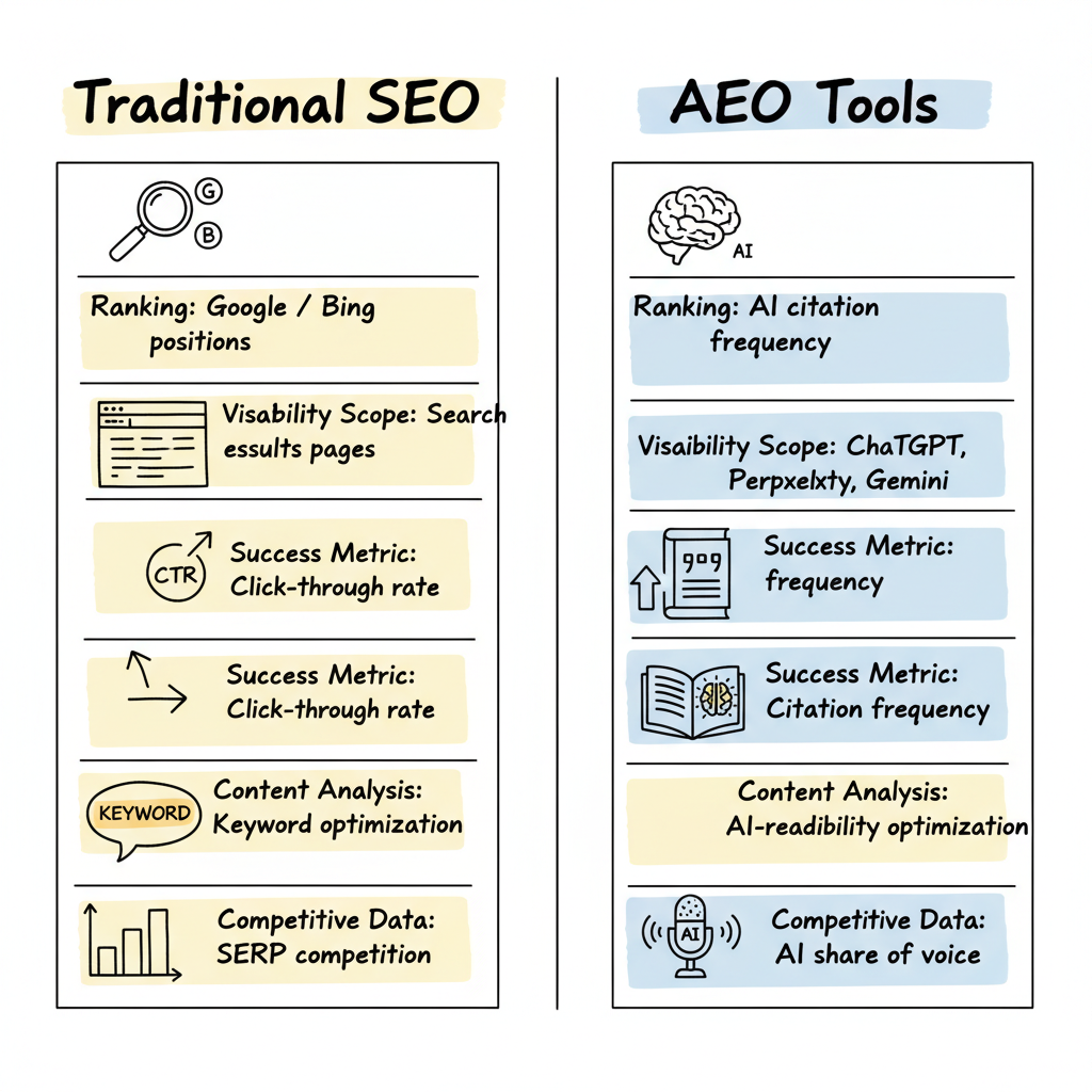 Yes. Traditional SEO tools track Google rankings; AEO tools track AI citations. These are different systems requiring different tracking approaches. Your existing SEO platform won't show whether ChatGPT mentions your brand or how often Perplexity cites your content.