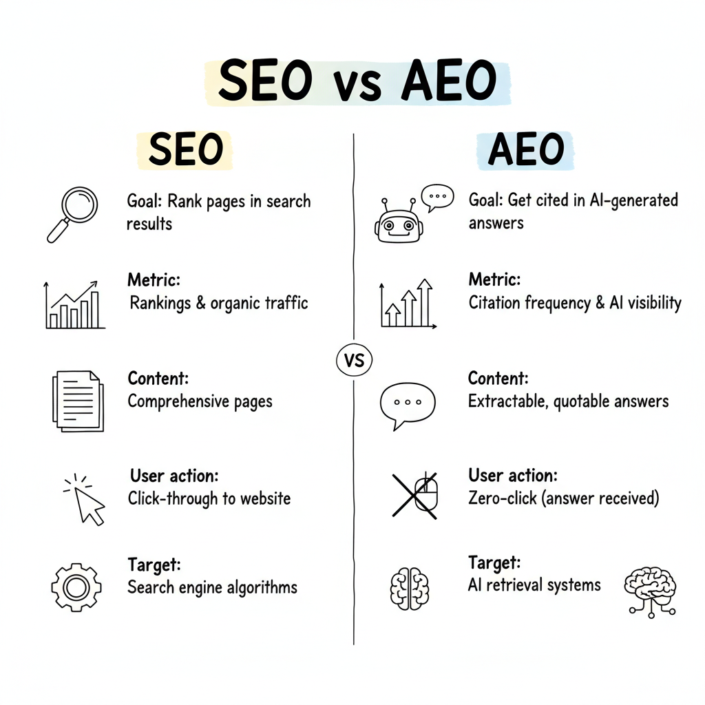 AEO and SEO serve different but complementary purposes. SEO gets your pages ranked; AEO gets your content cited in AI responses.