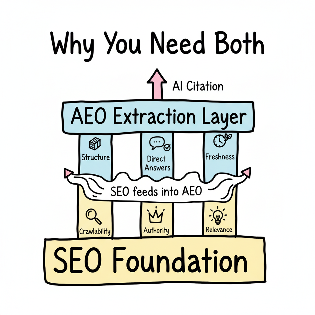 Neither replaces the other. Strong SEO foundations support AEO success. Without crawlability and authority, AI systems won't find or trust your content.