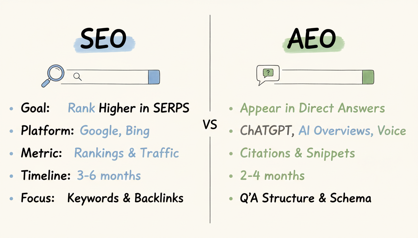 Answer Engine Optimization (AEO) has emerged as the complementary discipline to traditional SEO, designed to ensure your content appears in AI-generated answers, featured snippets, and voice search results. Understanding how AEO differs from SEO—and when to prioritize each—determines whether your brand stays visible or disappears into algorithmic obscurity.