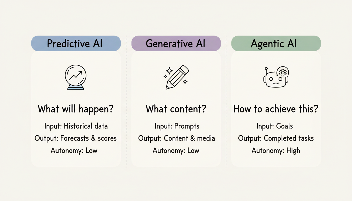 Three distinct AI paradigms now shape business technology: Predictive AI forecasts what will happen, Generative AI creates new content, and Agentic AI executes autonomous actions. Each solves different problems. Confusing them leads to misapplied tools and missed opportunities.