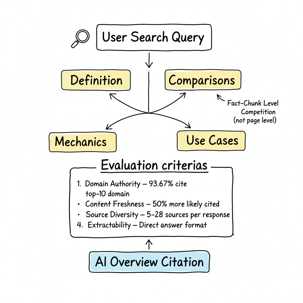 Understanding the selection mechanism is essential for optimization. AI Overviews don't simply pull from top-ranked pages—they use a sophisticated multi-stage process.