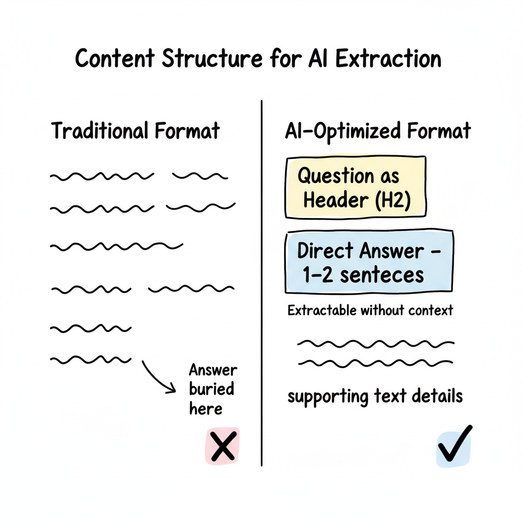 Content that buries answers after lengthy introductions rarely gets cited. Lead with the answer, then elaborate.