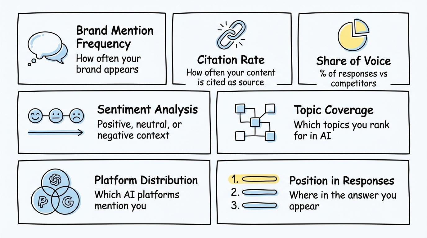 Brand Mention Frequency How often does your brand appear in AI-generated responses? This baseline metric tracks raw visibility—the number of times AI platforms mention your company, products, or content when answering relevant queries. Frequency matters because repeated mentions build recognition and trust.
