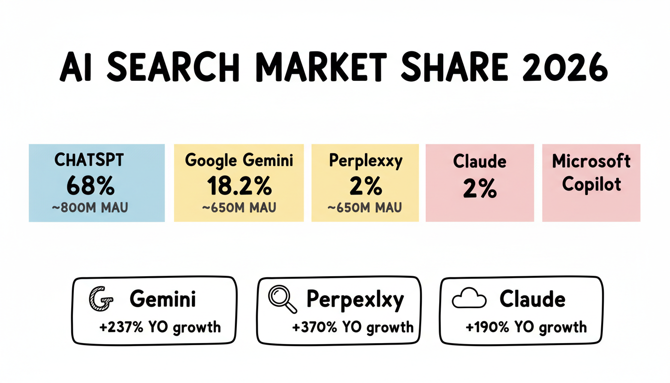 Google Gemini has emerged as the fastest-growing major platform, reaching 18.2% market share with 650 million monthly active users—up from 450 million in mid-2025. Year-over-year growth exceeds 237%, driven by integration across Search, Android, Chrome, and Workspace products.