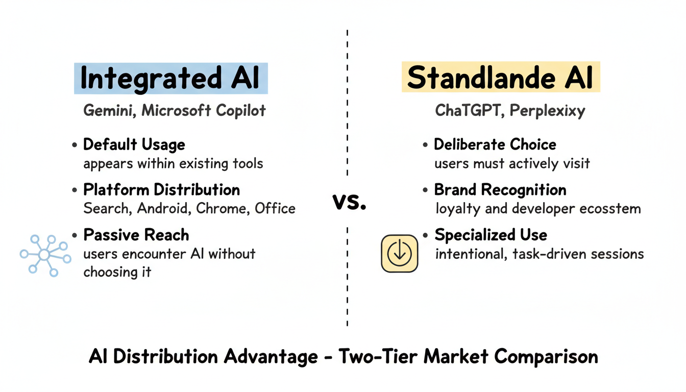 Google's Gemini growth illustrates this principle. Integration into Search, Android, Chrome, and Workspace creates default usage that pure-play AI tools can't match. Users encounter Gemini without deliberately choosing it—the AI appears within tools they already use.