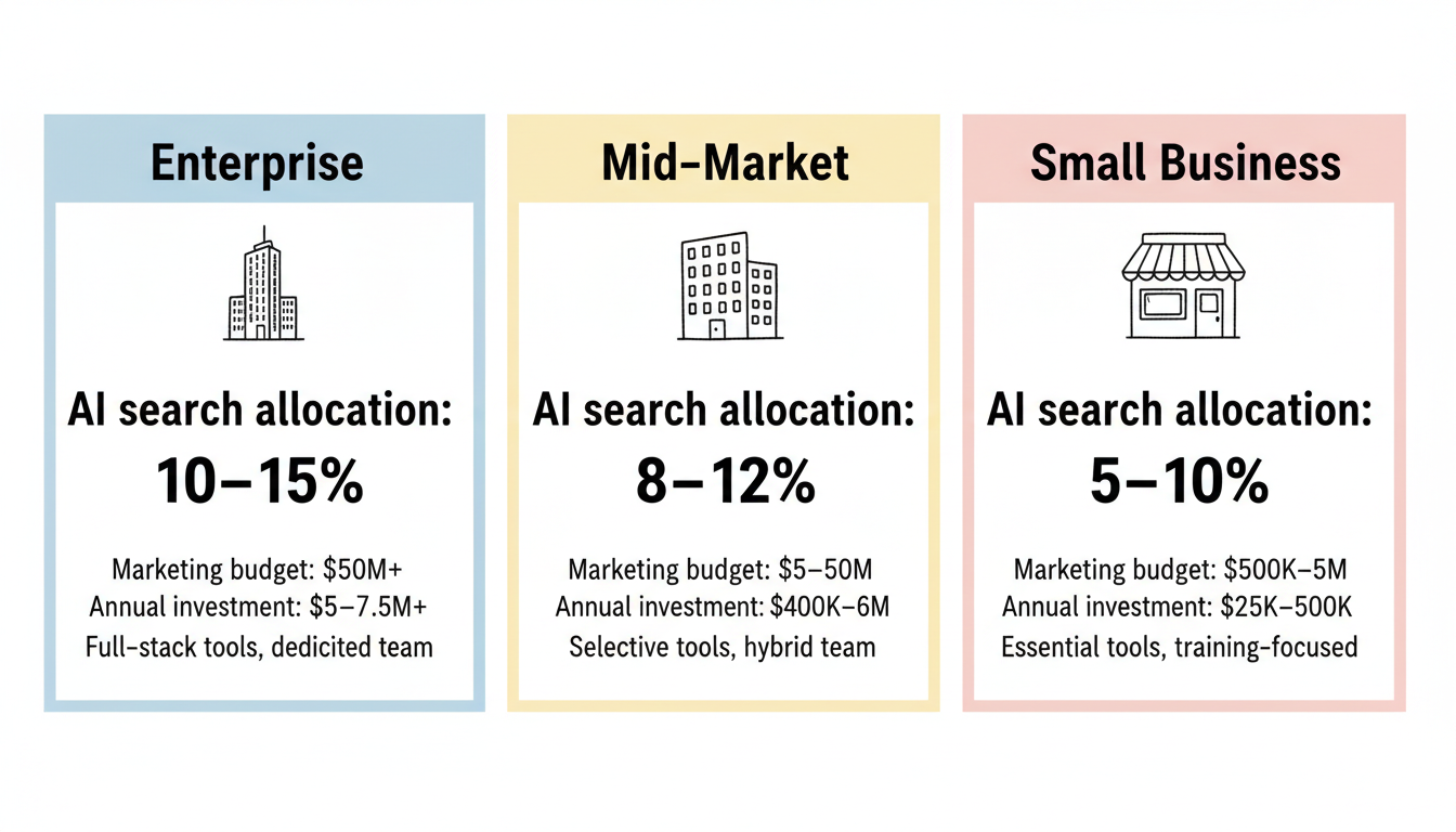 Enterprise organizations typically allocate 10-15% of digital marketing budgets to AI search, while mid-market companies allocate 8-12%, and smaller businesses 5-10%. The 2026 benchmark for enterprise averages 12% of digital marketing spend dedicated to AEO/GEO, with 94% of organizations planning to increase this allocation.