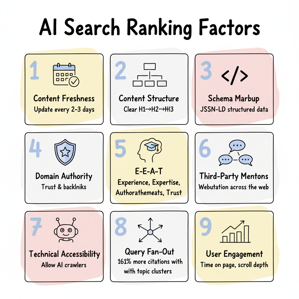 AI search ranking factors build on traditional SEO foundations but add new requirements—especially around freshness, structure, and schema implementation. The brands winning AI visibility in 2026 combine: