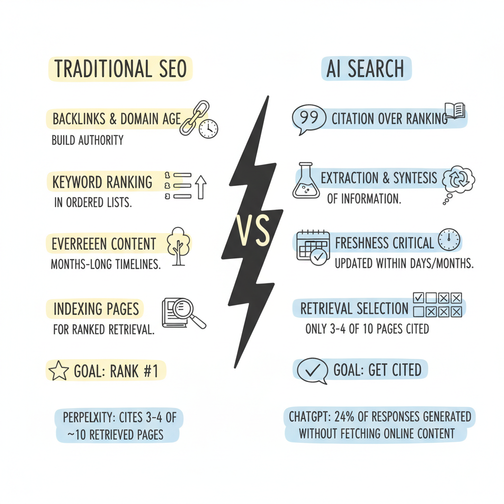 Traditional SEO builds authority over months through backlinks, domain age, and keyword optimization. AI search operates differently: