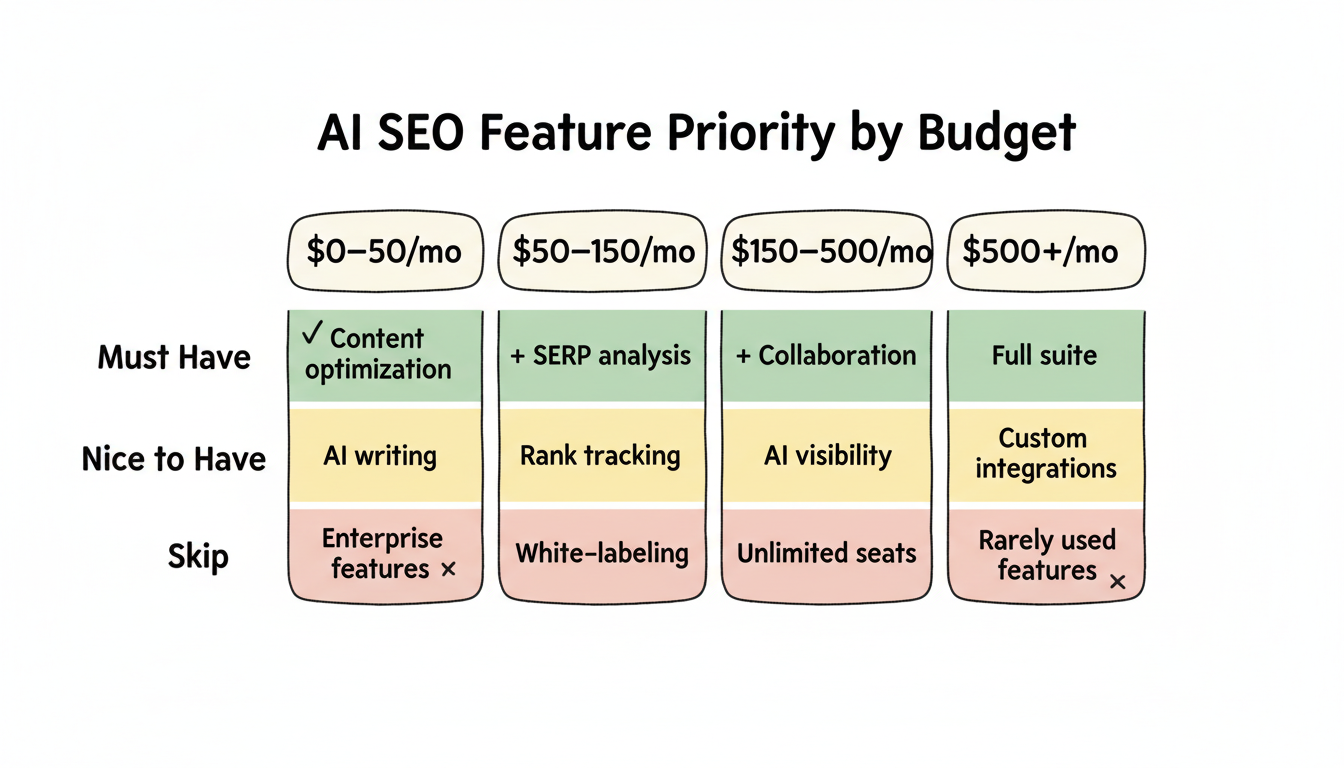 How much should I budget for AI SEO tools? Solo practitioners: $50-150/month. Small teams: $150-400/month. Growing companies: $400-1,000/month. Enterprise: $1,000+/month. Start at the lower end and upgrade based on demonstrated need.