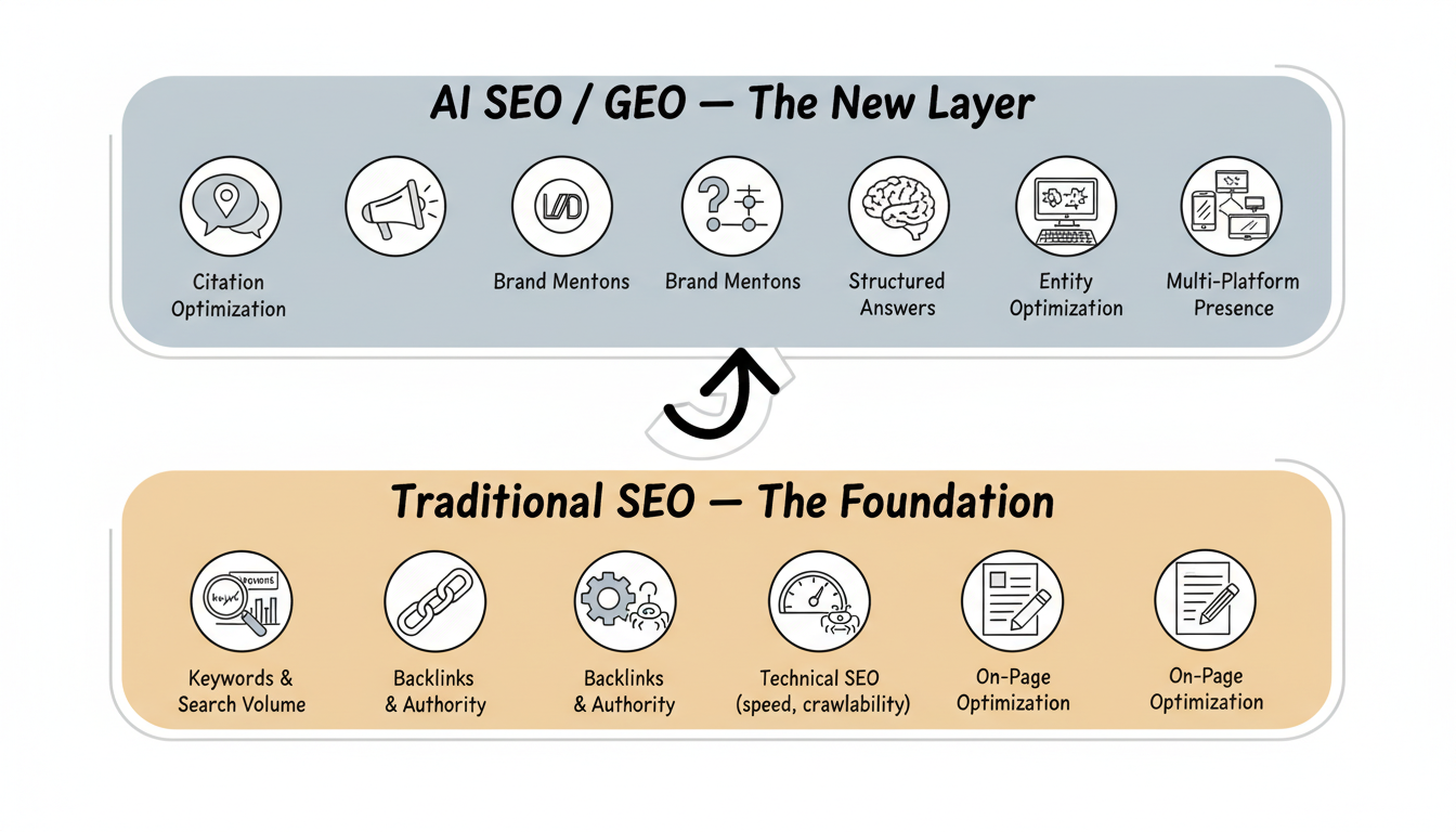 No. Traditional SEO remains the foundation for search visibility. AI systems tend to cite sources that already rank well in traditional search. The two approaches are complementary, not competing.