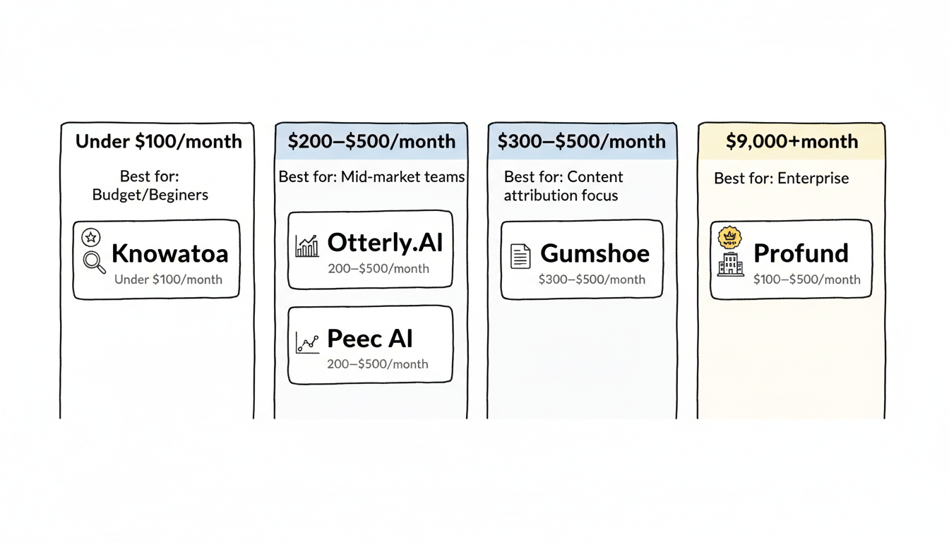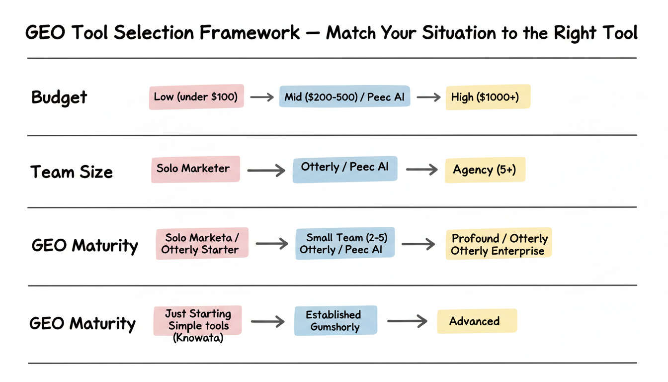 Solo marketers: Prioritize ease of use over feature depth. Knowatoa or Otterly basic tier. Avoid tools requiring dedicated analysts.