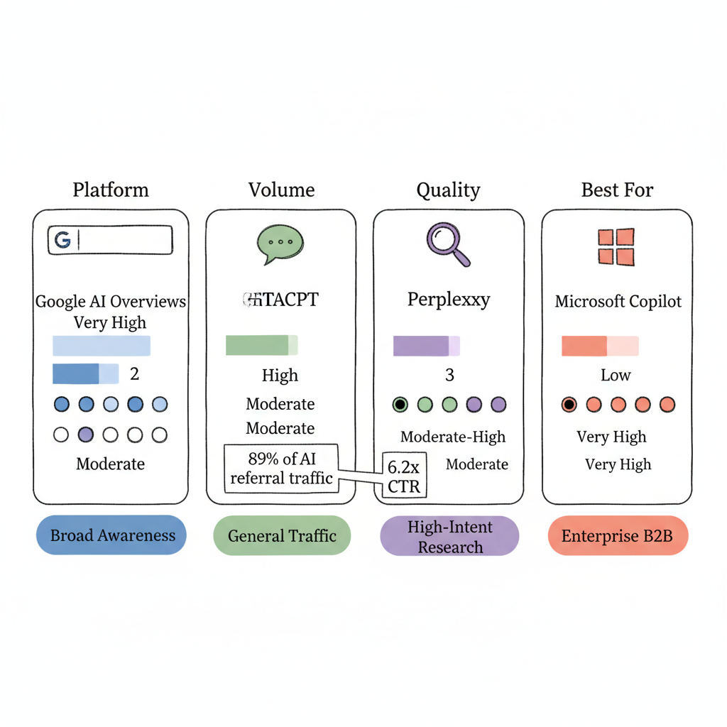 Perplexity | Moderate | Very High | Research traffic, high-intent users |