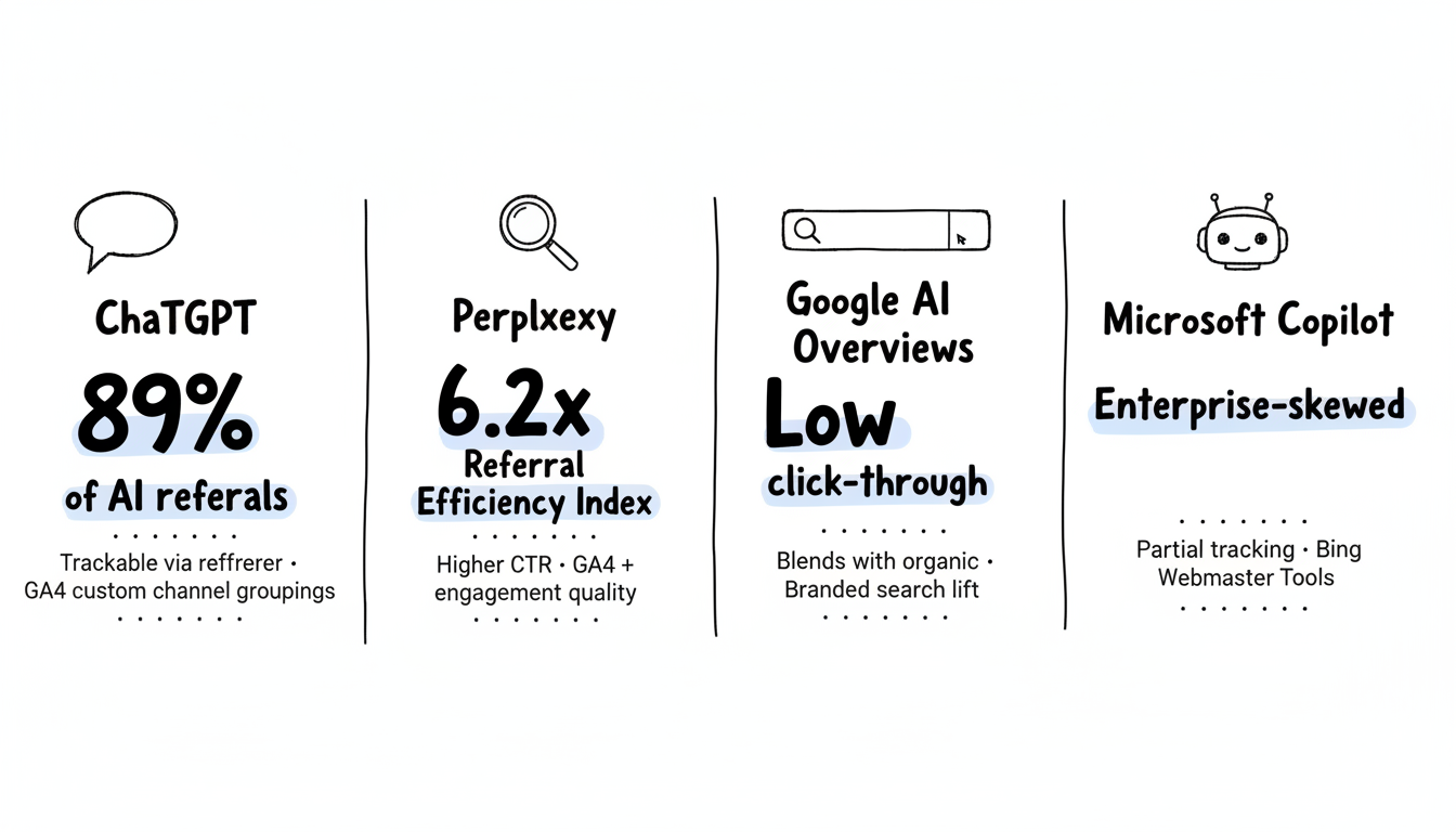 ChatGPT | Trackable via referrer | 89% of AI referrals | GA4 custom channel groupings |