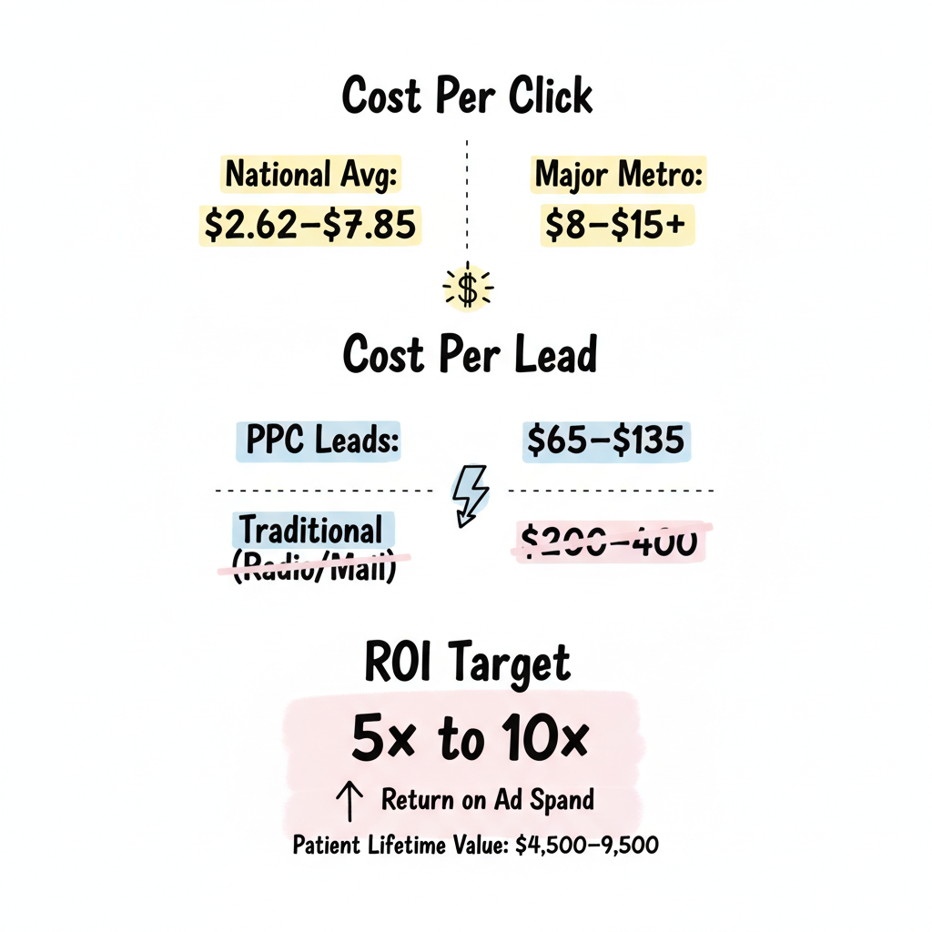 If your PPC campaign acquires patients for $200 each, your ROI is exceptional. A healthy benchmark is 5:1 to 10:1 ROI on dental PPC spend.