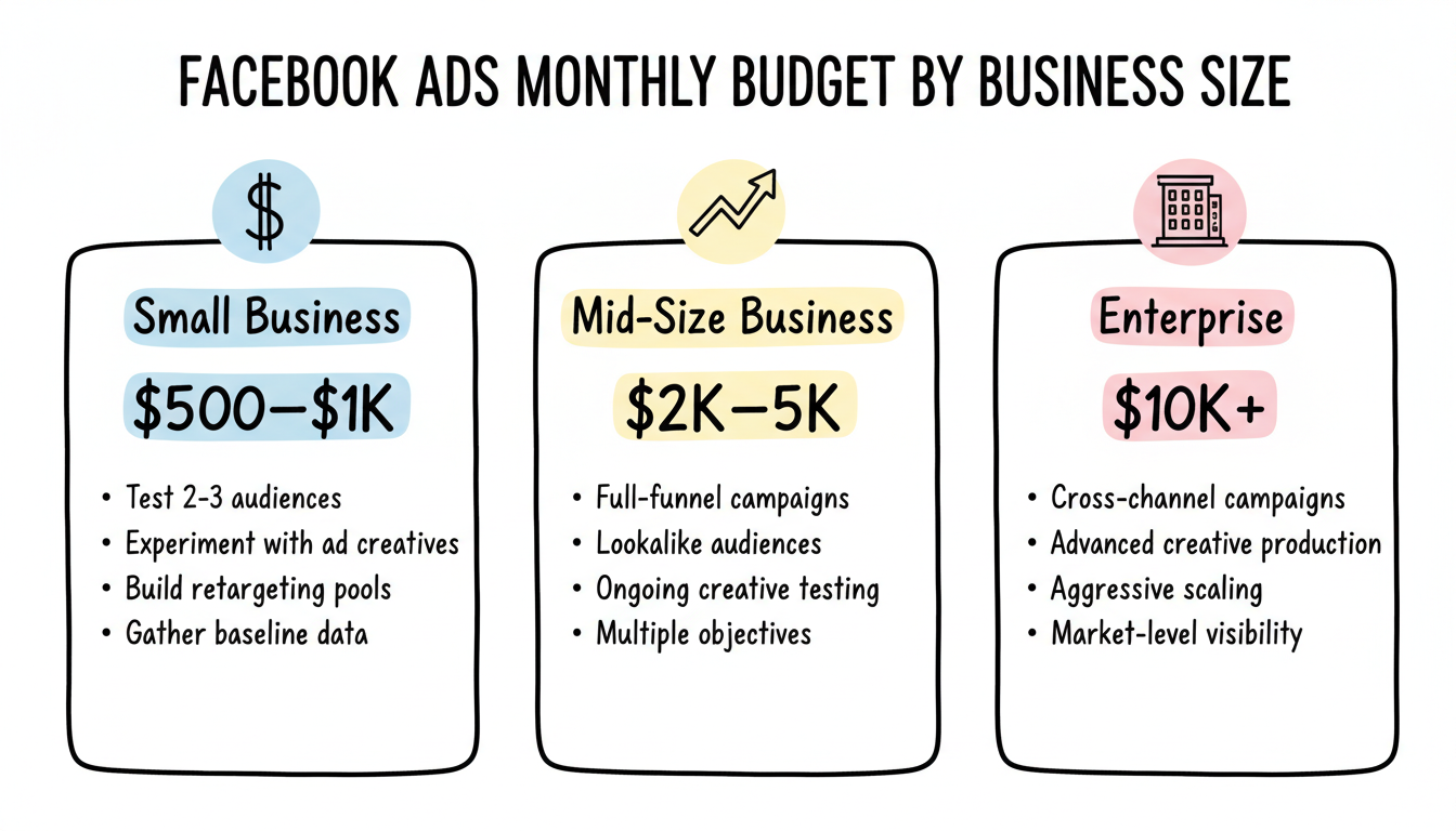 Established businesses typically invest $2,000 to $5,000 monthly in Facebook advertising. This budget enables: