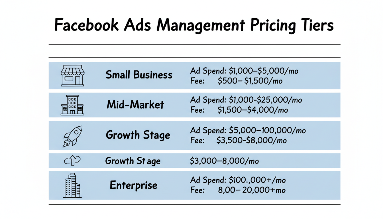 Facebook ads management pricing varies significantly based on service level, agency size, and your ad spend.