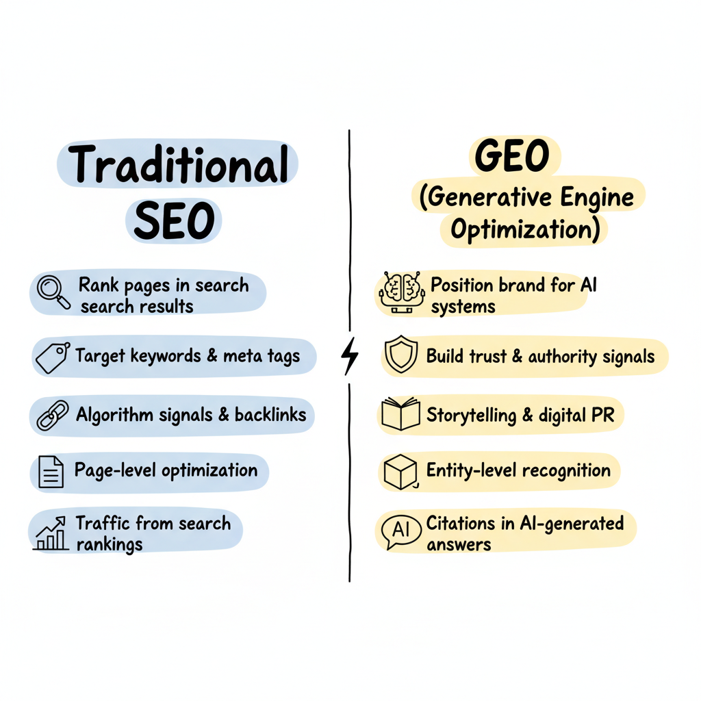 According to Forbes contributor William Arruda, unlike traditional SEO, which focuses on ranking pages, GEO is about making your expertise easy for AI systems to understand, trust, and recommend. This represents a fundamental shift in how brands approach visibility.