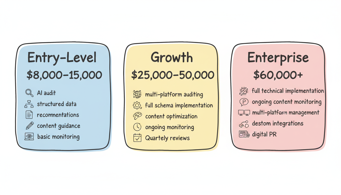GEO agency pricing varies by scope. Entry-level packages start around $8,000-15,000 for basic audits and recommendations. Growth packages range from $25,000-50,000 for comprehensive optimization. Enterprise programs typically start at $60,000+ for full-scale implementation and ongoing management. Specialized GEO monitoring tools alone can cost $150-500/month.