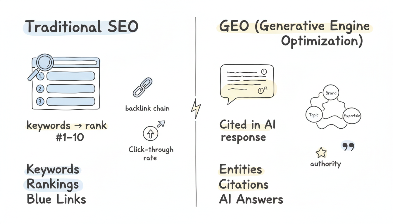 GEO (Generative Engine Optimization) focuses on getting content cited and referenced by AI-powered search engines like ChatGPT, Perplexity, and Google AI Overviews. SEO (Search Engine Optimization) focuses on ranking in traditional search results. While related, GEO emphasizes entity optimization, citation worthiness, and semantic completeness, whereas SEO focuses on keywords, backlinks, and technical optimization. Understanding what is GEO generative engine optimization clarifies the distinction.