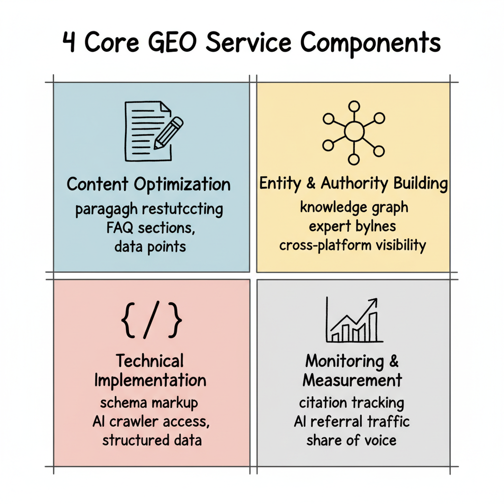 Services blend content, technical, and authority work. Effective GEO requires content restructuring, technical implementation, and authority building—not just one component.