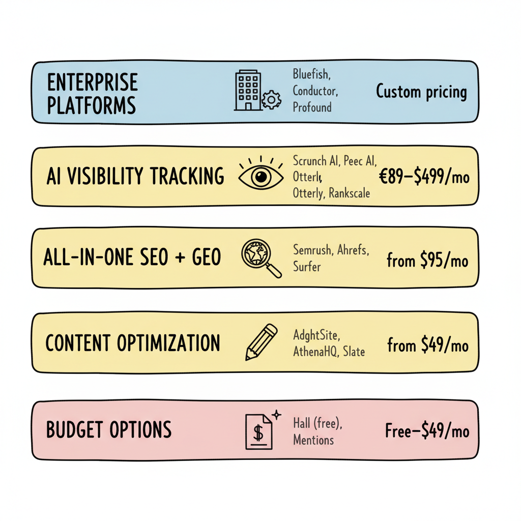 The GEO software market includes several distinct categories, each addressing different aspects of AI visibility optimization.