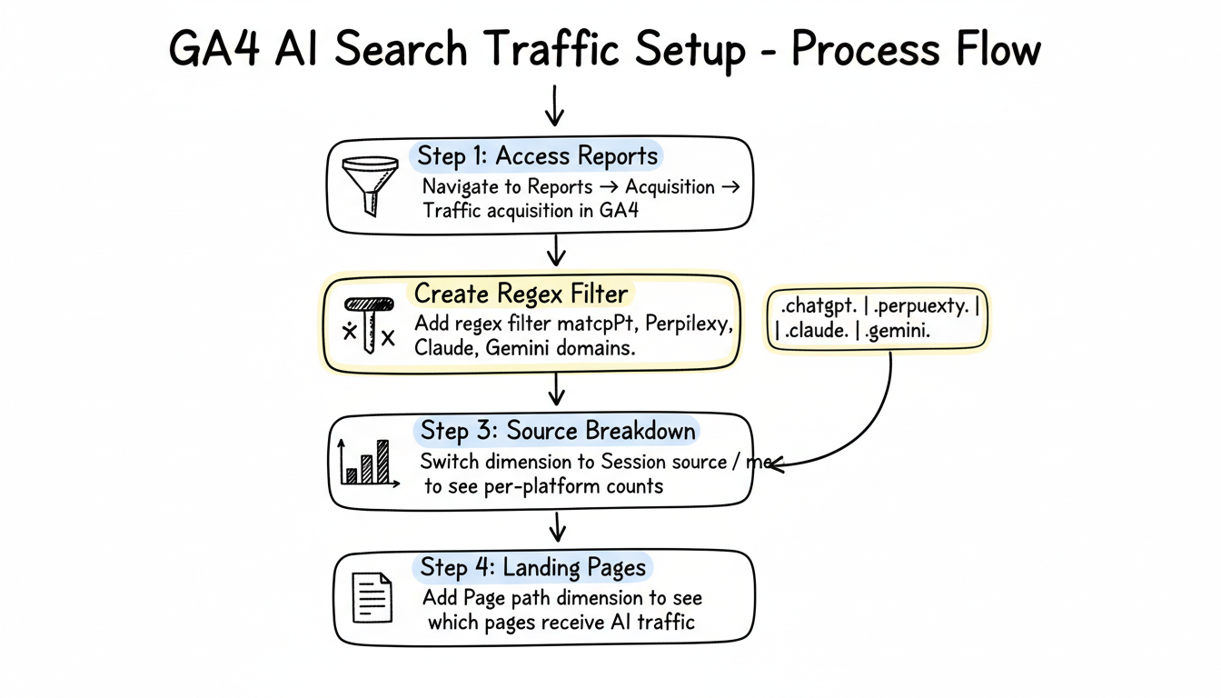 Setting up AI traffic tracking in GA4 requires creating filters that identify traffic from AI platforms as distinct referral sources.