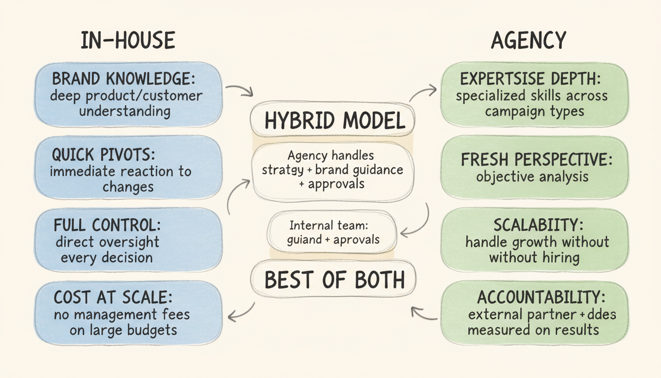 Platform expertise: Agencies manage multiple accounts daily, giving them pattern recognition you can't develop with one account. They've seen what works across industries and budget levels.