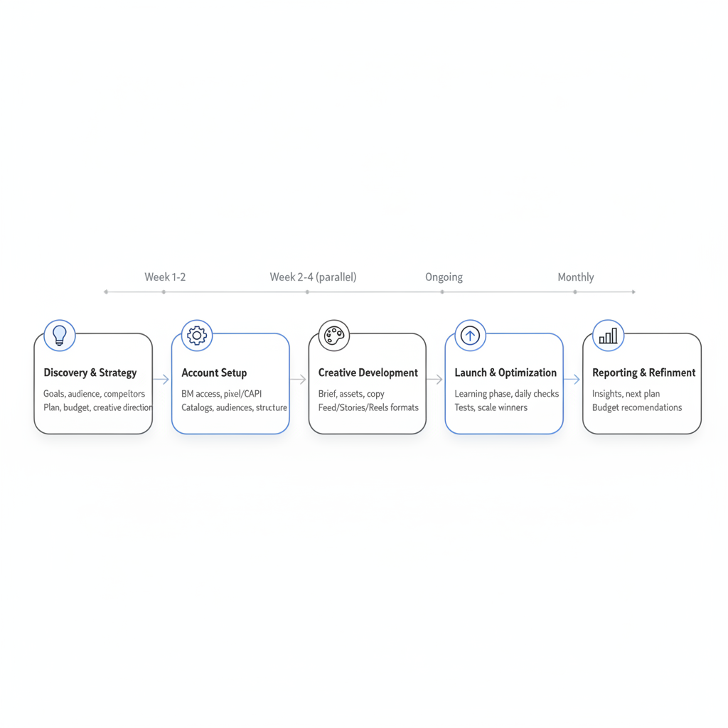 Testing infrastructure – Systematic A/B testing that improves results over time. This is especially important when you're learning how to run effective Facebook ads across the entire Meta platform.