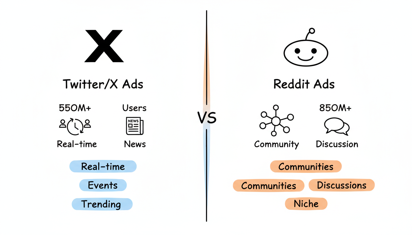 Reddit ads vs Twitter ads (now X) presents a choice between two platforms known for real-time conversation and engaged communities. Twitter excels at trending topics and real-time engagement, while Reddit offers deeper, more organized community discussions. Both platforms attract audiences that actively participate rather than passively consume.
