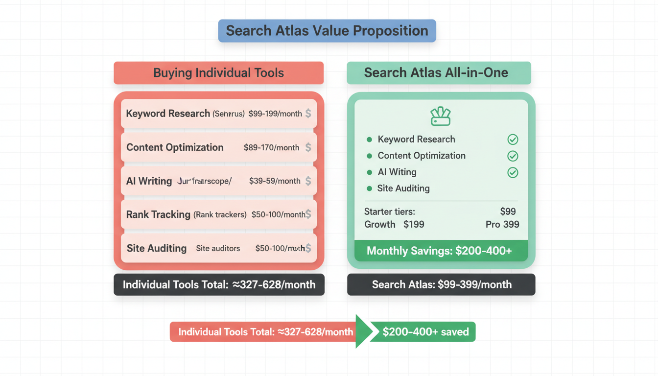 Potential savings: Teams using multiple tools could save $200-400/month by consolidating to Search Atlas.