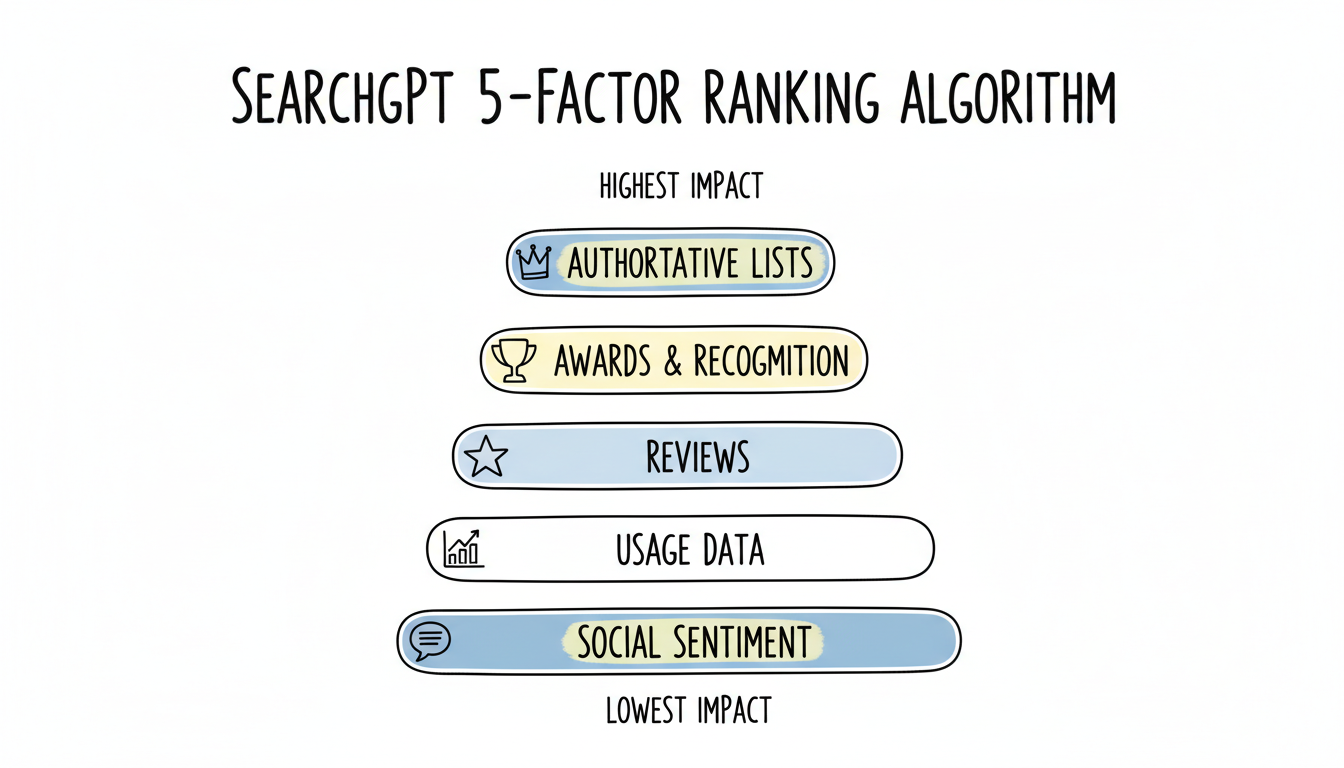 Authoritative list placement carries the most weight in SearchGPT's ranking algorithm. When SearchGPT encounters a query like "best AI SEO agencies," it prioritizes sources that appear on trusted, curated lists.