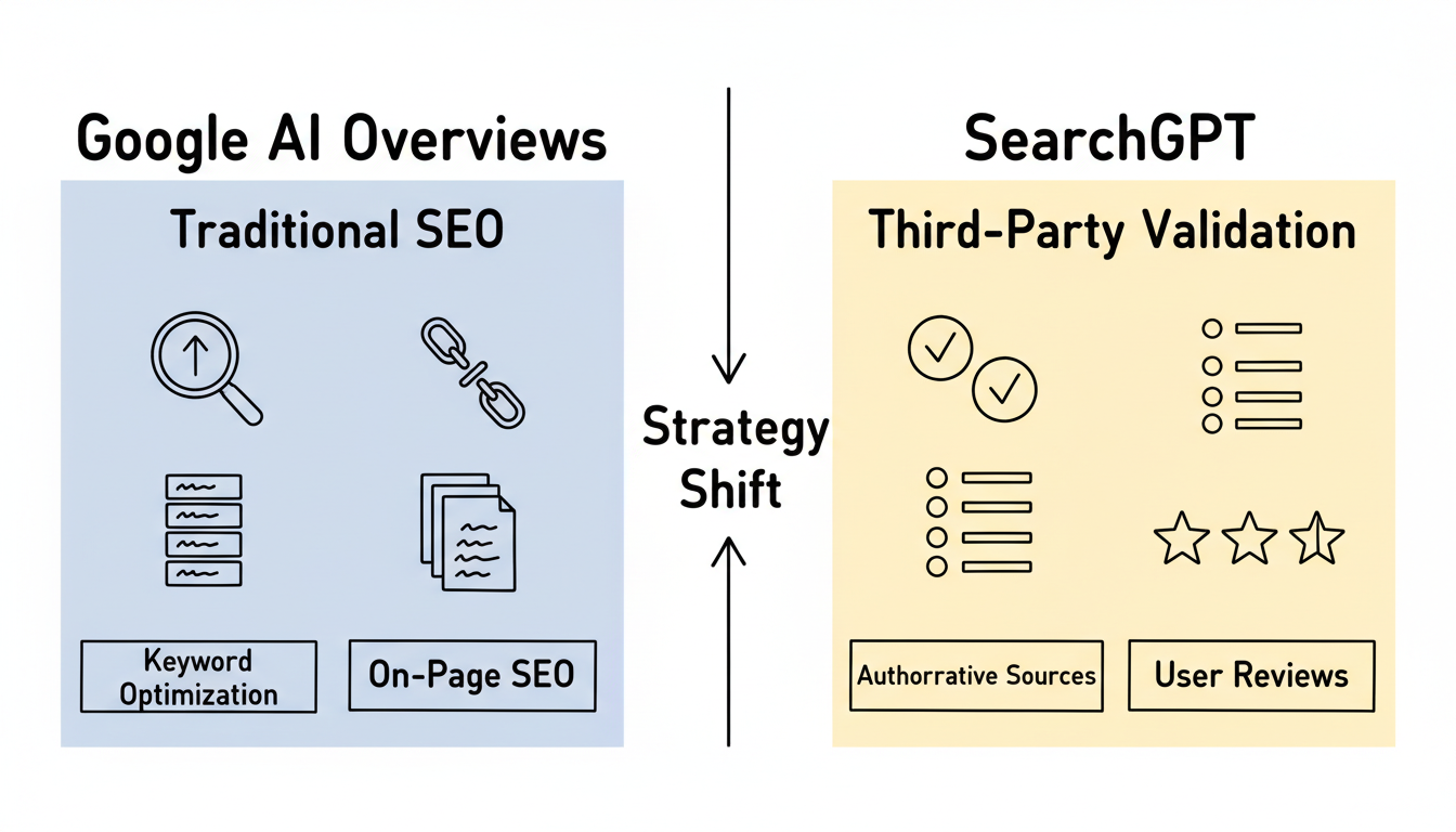 This hierarchy differs significantly from traditional SEO factors. While Google weighs backlinks, on-page optimization, and technical SEO heavily, SearchGPT prioritizes third-party validation and real-world reputation signals. Understanding these distinctions becomes crucial when implementing a comprehensive AEO strategy framework that spans multiple AI search platforms.