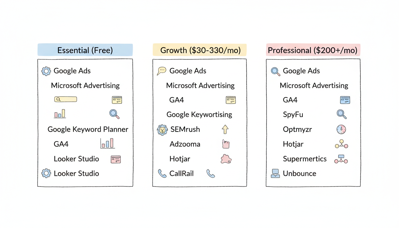No. You can run successful campaigns using only the built-in tools from Google and Microsoft Advertising, plus free analytics from Google Analytics 4. Paid tools become valuable when you need deeper competitive intelligence, time-saving automation, or advanced reporting capabilities.