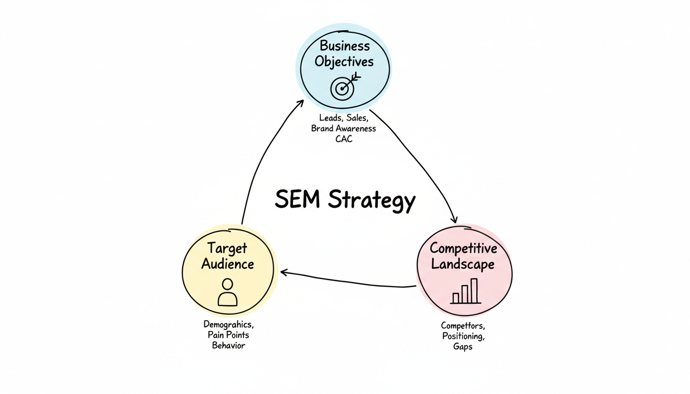 Every successful SEM strategy starts with understanding three core elements: your business objectives, your target audience, and your competitive landscape.