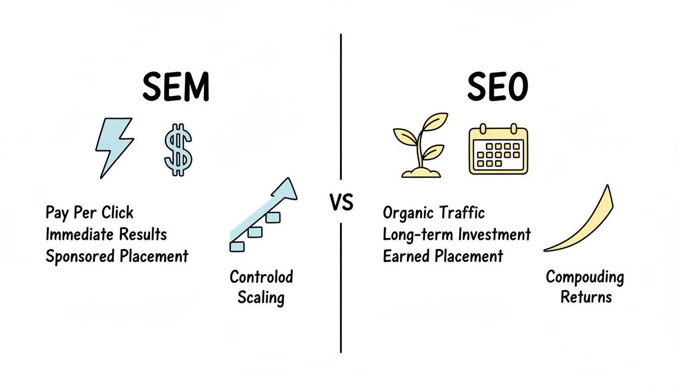 Search marketing offers two distinct paths to visibility: pay for placement immediately or earn it organically over time. Understanding the difference between SEM and SEO helps you allocate resources effectively and build a strategy that delivers both quick wins and sustainable growth.