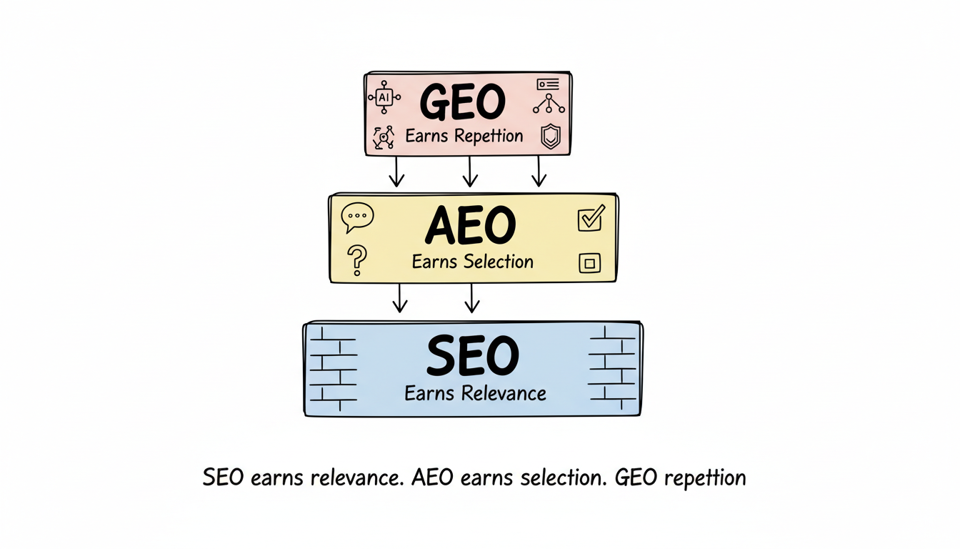 A helpful framework: SEO earns relevance. AEO earns selection. GEO earns repetition.