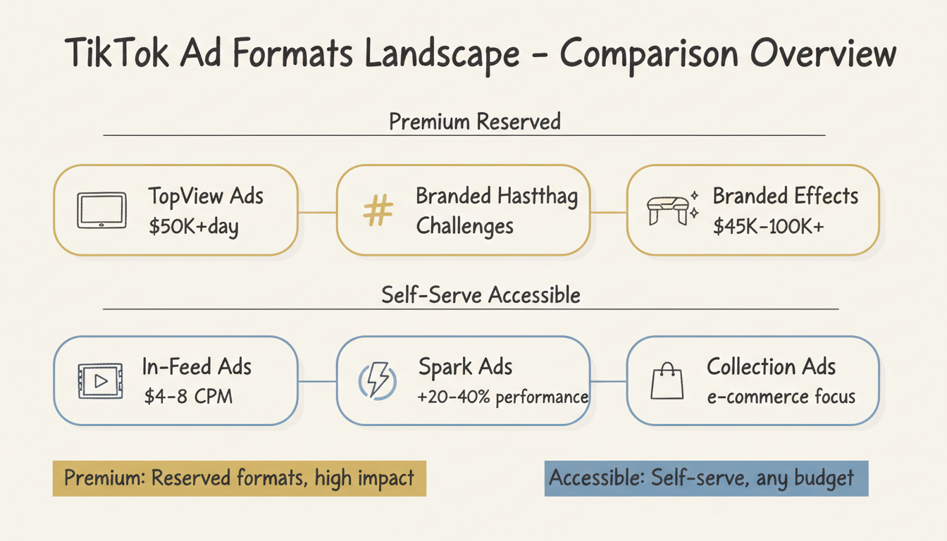 Small businesses can access In-Feed Ads, Spark Ads, and Collection Ads through TikTok Ads Manager with no minimum spend requirements beyond $50/day campaigns. Premium formats like TopView, Branded Hashtag Challenges, and Branded Effects require significant investment and typically require working directly with TikTok.
