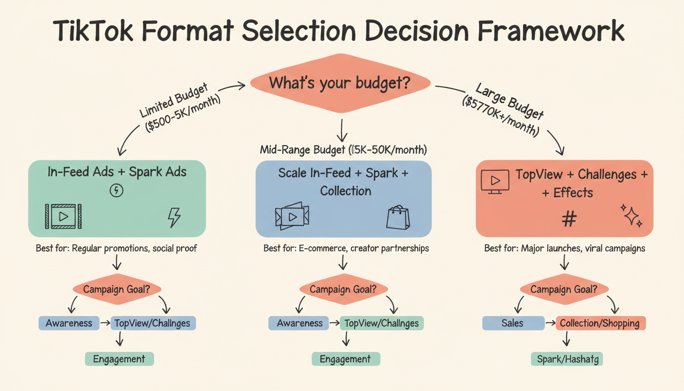 For most advertisers, Spark Ads typically deliver the highest ROI because they amplify content that has already proven engagement. They outperform standard In-Feed Ads by 20-40% on average while maintaining authenticity. However, optimal format depends on your specific goals and creative assets.