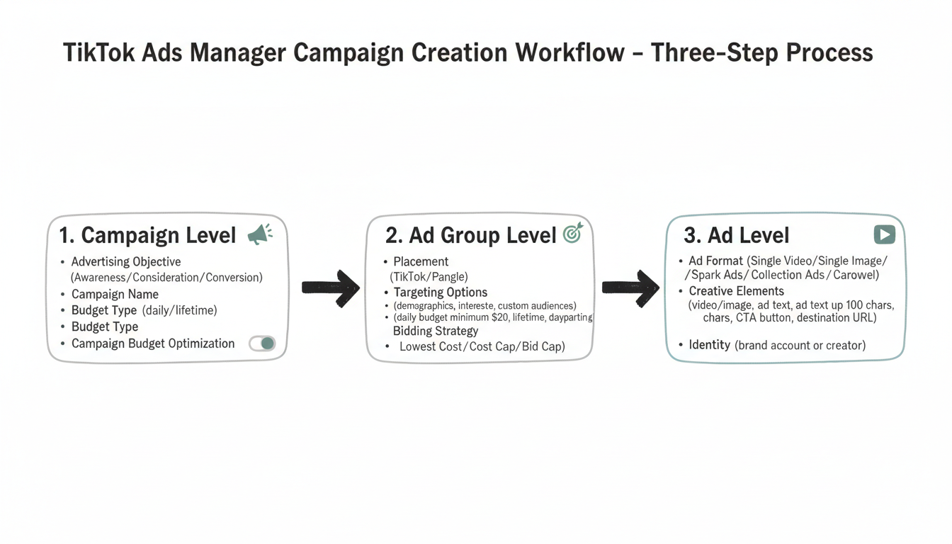 TikTok Ads Manager uses a hierarchical structure: