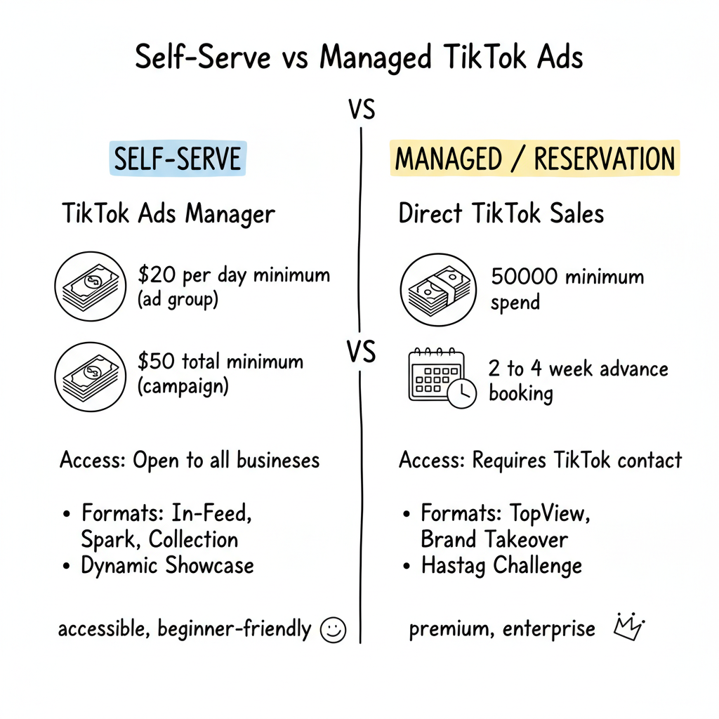 TikTok offers two distinct advertising tiers with dramatically different pricing structures.