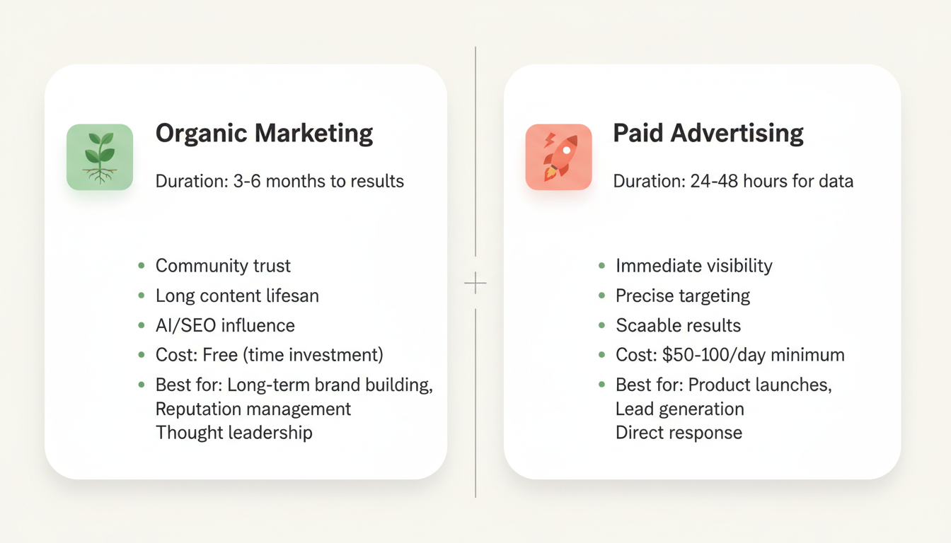 Start with organic. Spend 4-8 weeks building account history, understanding communities, and testing content before any paid advertising. This organic foundation makes paid campaigns more effective—you'll understand what resonates, have credibility if users check your profile, and know how to respond to comments authentically.
